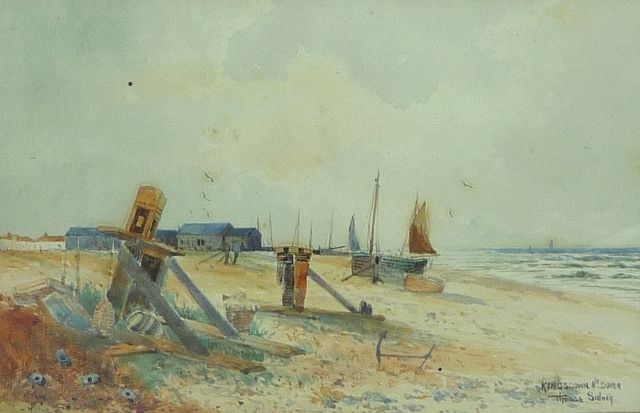 | Kingsdown, Nr. Dover Beached fishing vessels and two figures on a sandy shore with gulls and timber huts beyond | |