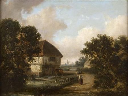 A WOODED RIVER LANDSCAPE WITH FIGURES AND COTTAGES