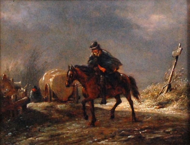 | Windswept country scene at dusk with figure on horseback and wagon beyond | |
