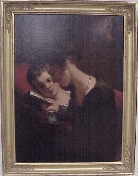 | woman in profile seated with book and child on her far side facing viewer | |
