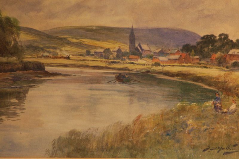 | Northumberland river landscape with figures seated by the river bank and a rowing boat in the middle distance | |