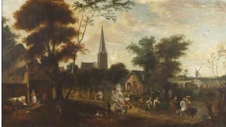 | A BUSY VILLAGE SCENE WITH CAROUSING FIGURES AND DISTANT WINDMILL | |