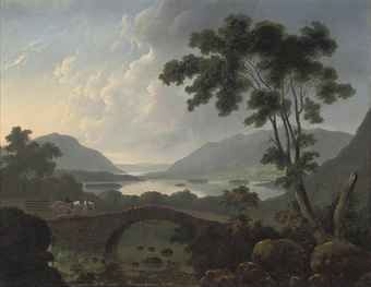 | An extensive landscape in the Lake District with a horse-drawn cart crossing a bridge | |