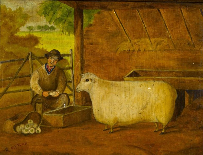 | PORTRAIT OF A PRIZE SHEEP IN A BYRE WITH A FARMER CUTTING TURNIPS | |
