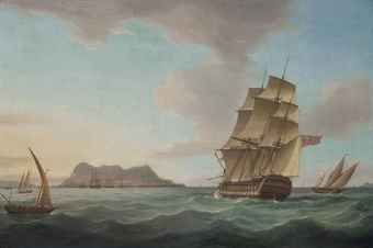 | A Royal Navy Third Rate heeling in the breeze as she arrives off Gibraltar to join a Squadron of the Red lying at anchor inshore | |