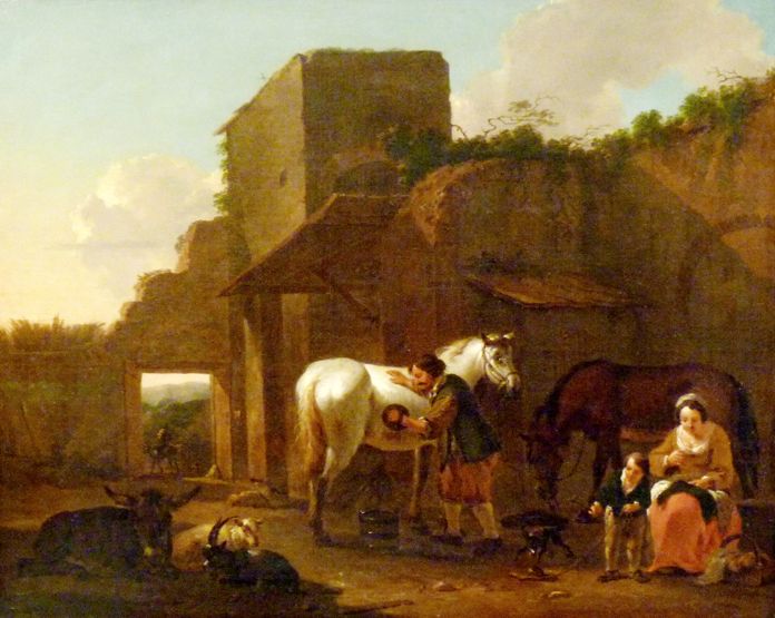 A MAN GROOMING A HORSE BY A BARN, WITH A WOMAN AND A CHILD NEARBY
