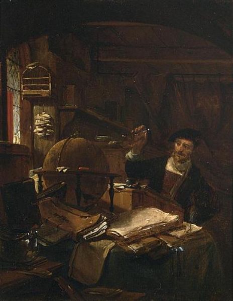 AN ALCHEMIST IN HIS STUDY WITH A GLOBE AND PAPERWORK ON A TABLE