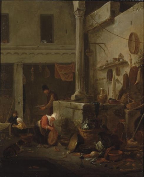 Peasants cooking and cleaning in a courtyard