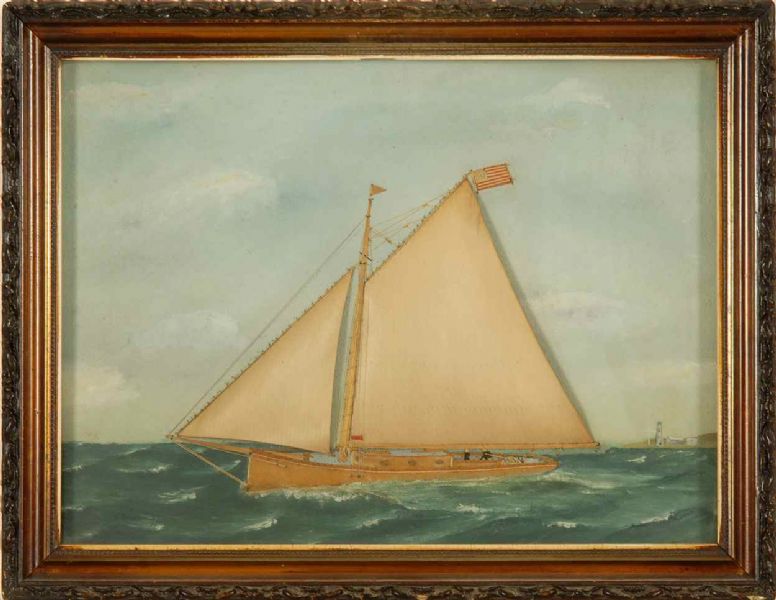 Catboat off a coast.