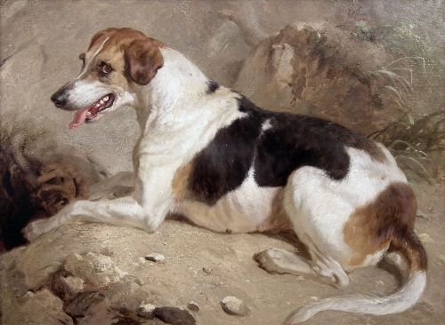 Foxhound at an Earth - Portrait of a black and tan hound seated on a rocky outcrop