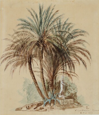 | View from a Roman garden with palm trees and agave encircling a sculpture | |