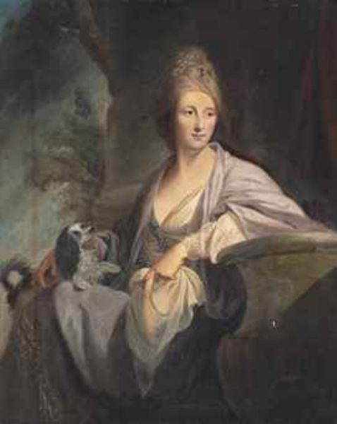 | Portrait of a lady, three-quarter-length, in a white dress, seated in a landscape with a spaniel | |