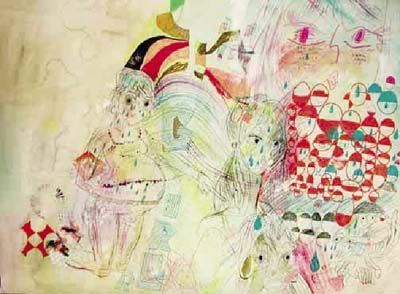 | Acrylic ink, graphite, wax crayon and glitter on paper. | |