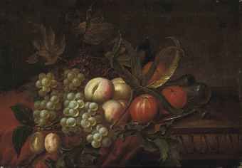 | Grapes, oranges, peaches and a pomegranate on a pewter platter, on a partly-draped table | |
