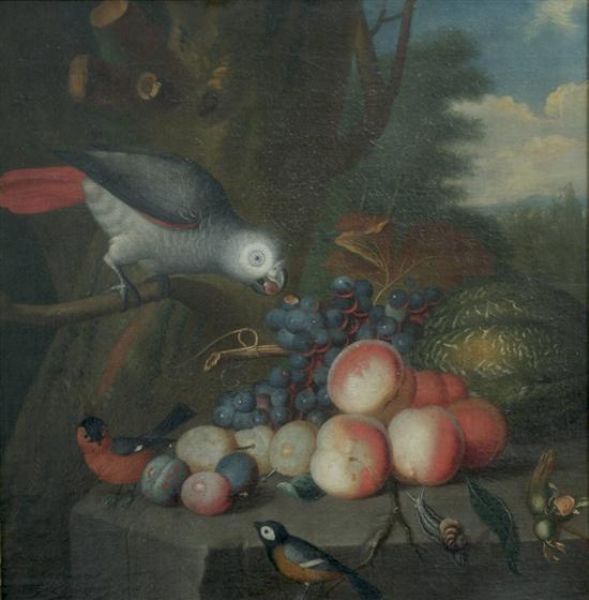 | Grapes, peaches and other fruits on table with a parakeet and bullfinches | |