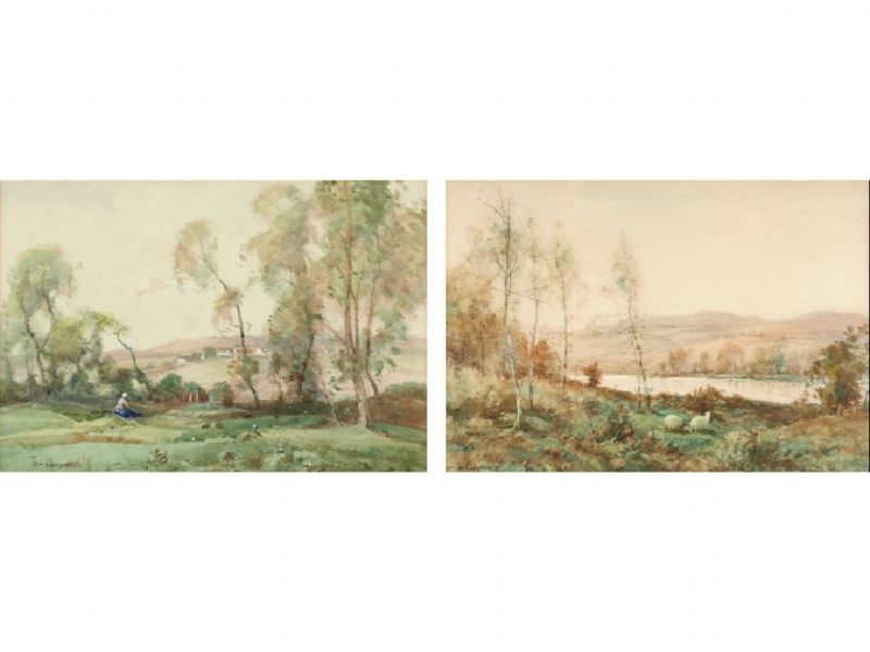| Summer landscape with a seated figure in a field, country cottages beyond; River landscape with sheep grazing in the foreground | |