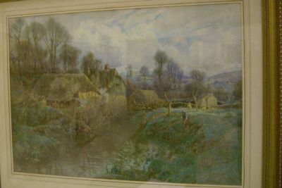 Extensive river landscape with figure fishing in the foreground, cottages beyond