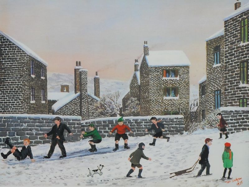 Street scene with children playing in the snow
