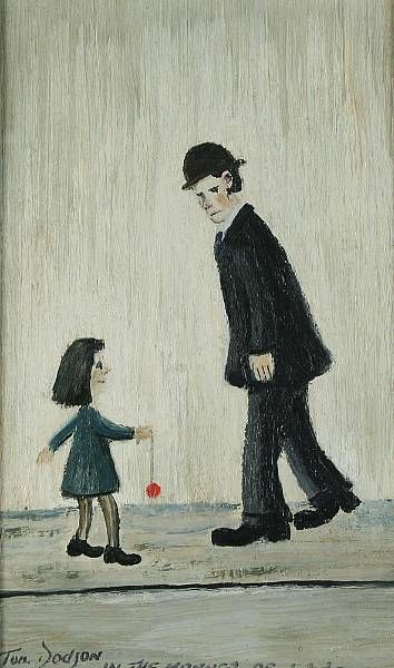 Street scene with man and girl, 'in the manner of L.S. Lowry'