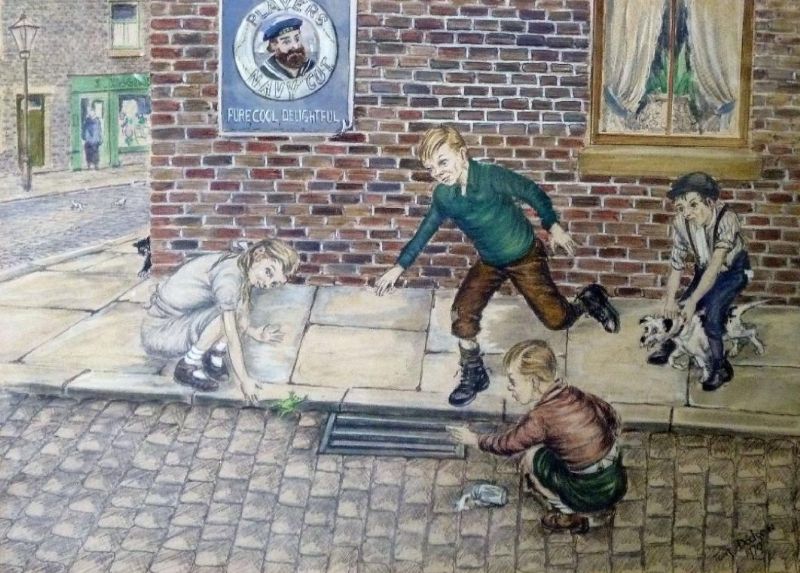 Three boys and a girl releasing a frog down a drain on a cobbled