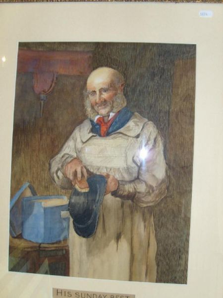 | An elderly man wearing an agricultural smock and cleaning his hat | |