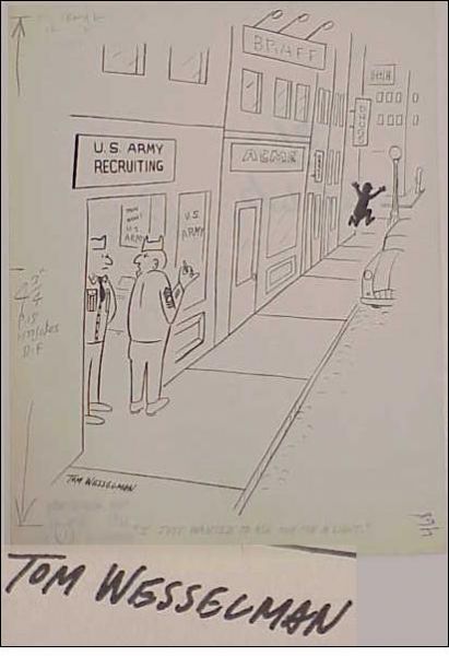 | cartoon depicting a man running away from two officers at an Army recruiter's office | |