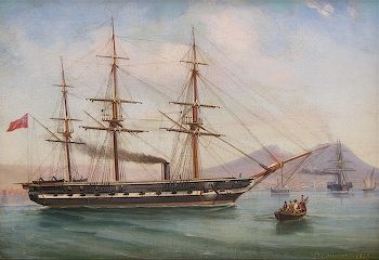 | A British Sailing Ship converted to steam power, in the Bay of Naples with Mt. Etna in the distance | |