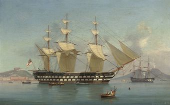 | H.M.S. Neptune funnel down and drying her sails off Naples, with the city's waterfront visible off her stern | |