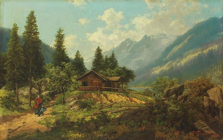 Sommerliche Hochgebirgslandschaft. Im Vordergrund Almhütte mit Figurenstaffage