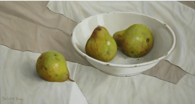 THREE PEARS IN EARTHENWARE BOWL ON LINEN