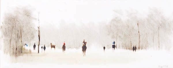 Winter park scene of riders with horses
