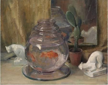 Stilleben mit Goldfischglas, Kaktus und zwei weißen Porzellanfiguren vor Spiegelhintergrund.