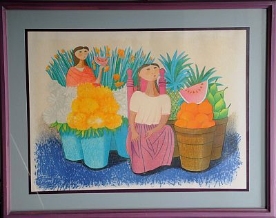 Niñas con flores y frutas
