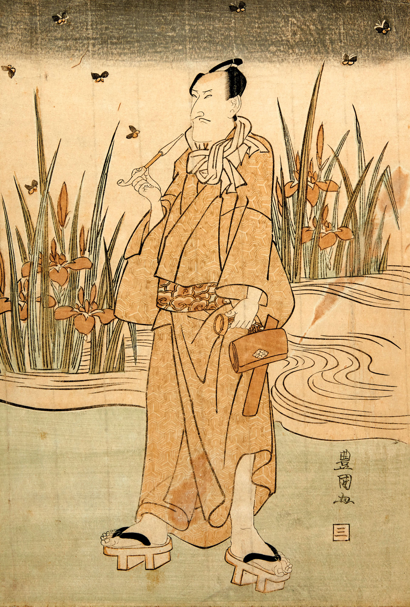 | Oban tate-e, partie de triptyque, acteur debout fumant une pipe près des iris | |