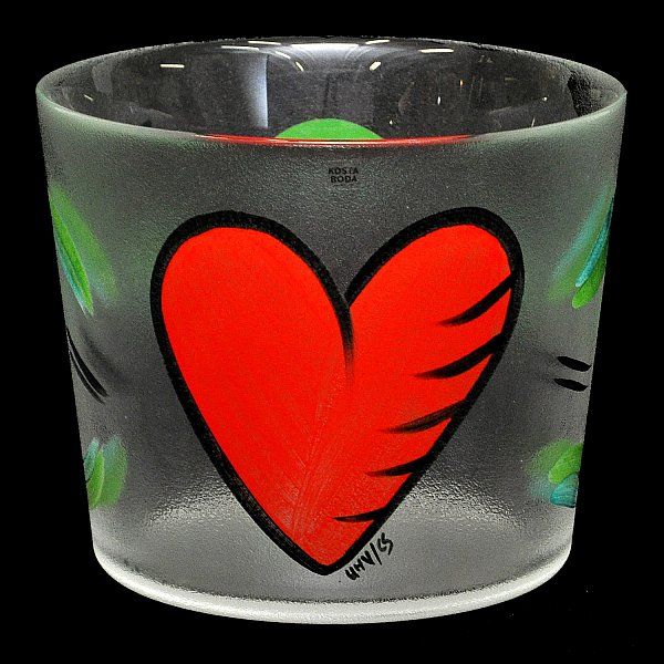 Dekor av rött hjärta mot mattat glas. Målarsignatur "UHV/CS".