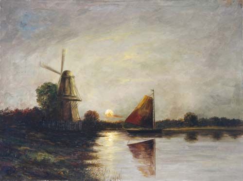Segelboot auf einem Gewässer vor einer Windmühle bei untergehender Sonne