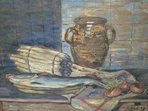 Still life of onions fish and a jar