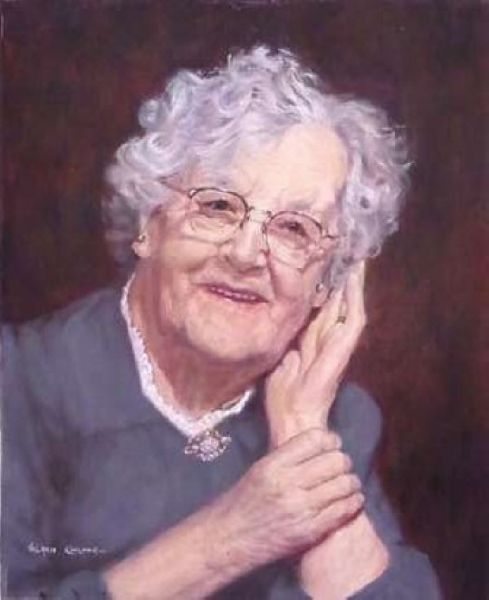 Bust portrait of an elderly lady, bespectacled and wearing a blue dress and an enamel brooch