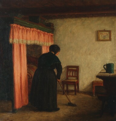Country interior with sweeping lady.
