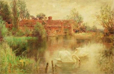 Frühlingslandschaft, Bauernhaus am See mit zwei Schwänen