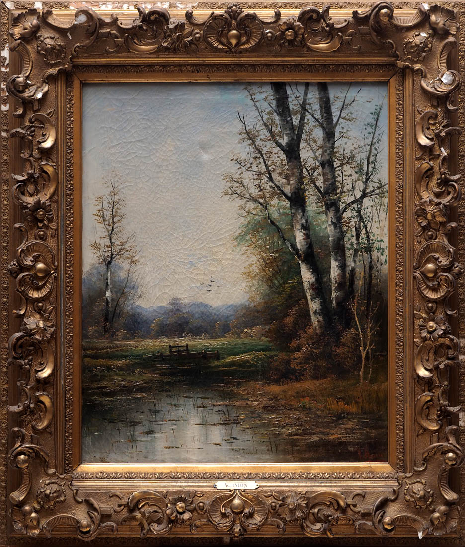 Autumn landscape, in the foreground a small pond with weir, on the bank a few birches with autumnal leaves