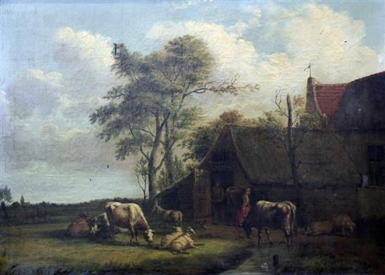 Cattle, figures and sheep outside a farmhouse