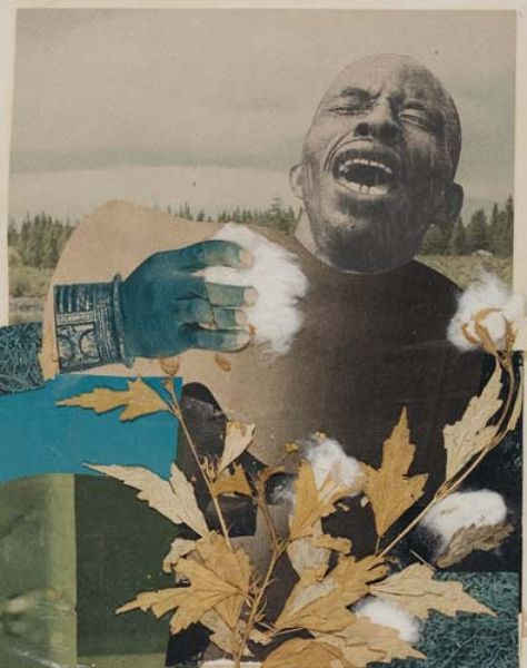 Collage of mixed papers and cotton plant