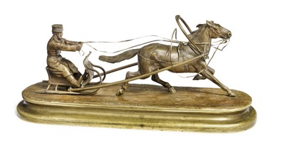 A Russian gilt bronze sculpture with a horse-drawn speeding troika and a cossack