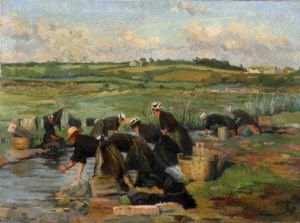 Washerwomen by a stream, (recto), family group in a wooded alpine alndscape, (verso)