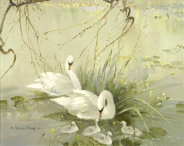 | Springtime, mute swans and cygnets with waterlilies and willow | |