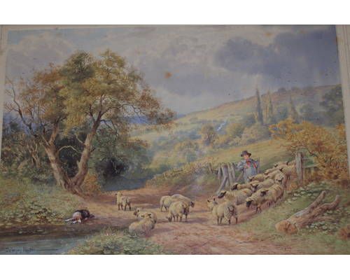 | Shepherd, flock and dog by a pond on a wooded country path, together with another, of a young farmer, dog and cattle by a pond, | |