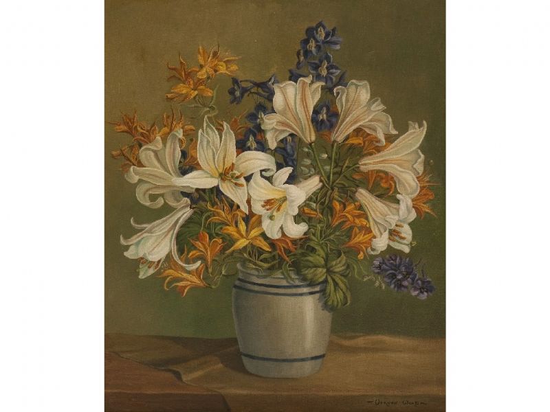 | STILL LIFE OF TIGER LILIES, WHITE LILIES AND DELPHINIUM IN A VASE | |