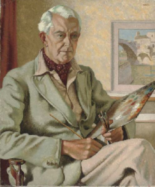 | Portrait of the artist's father, Charles H. H. Burleigh (1875-1956), seated half-length, in a green coat, holding brushes and a | |