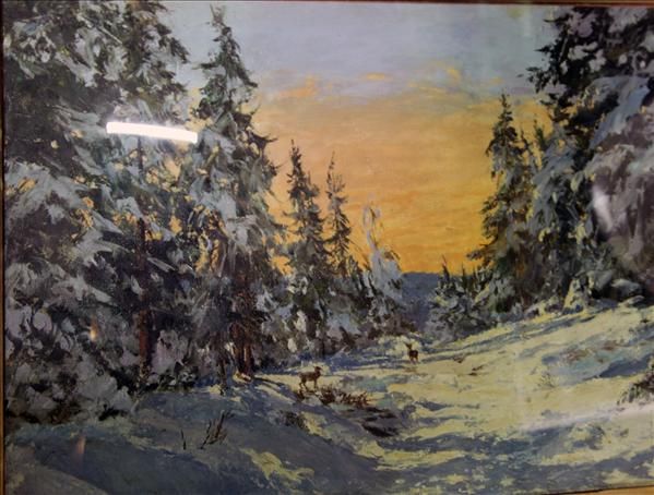 Deer in snowy woods with sunset beyond